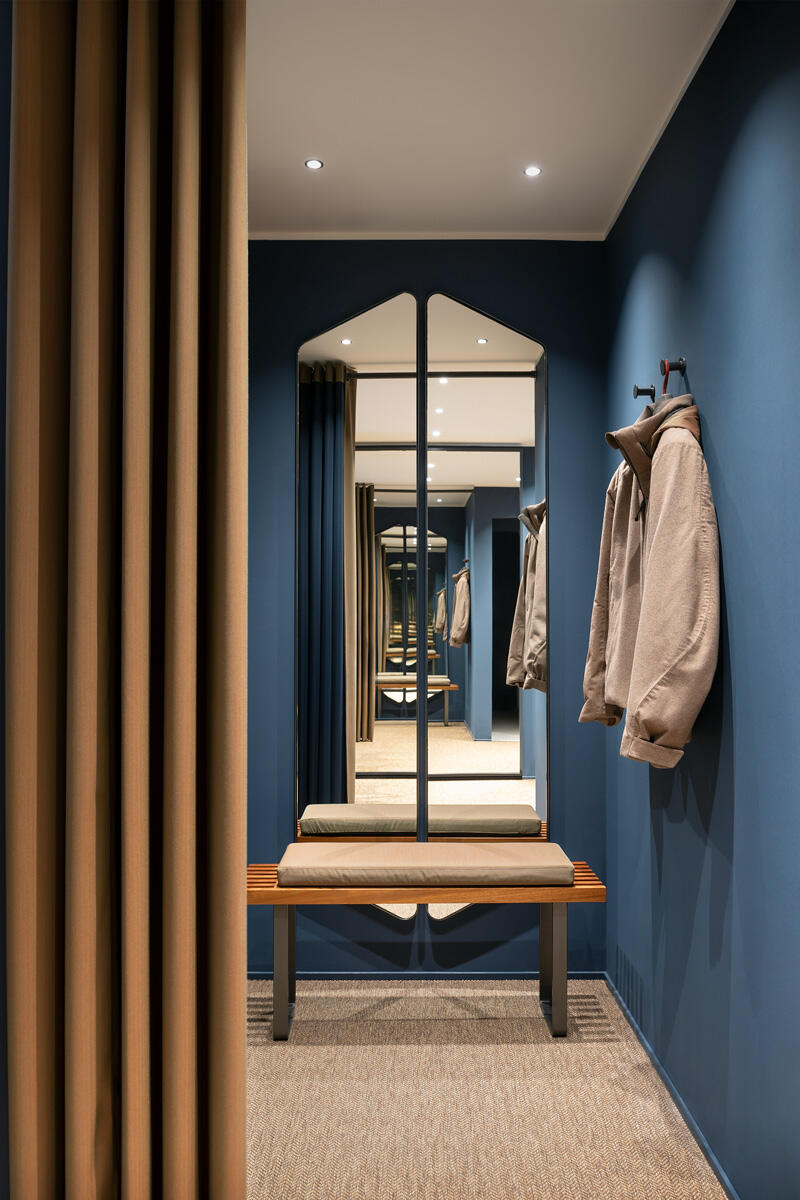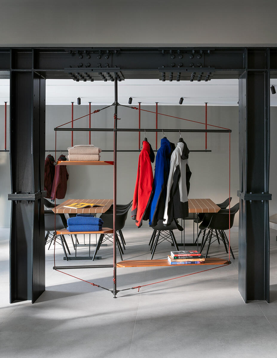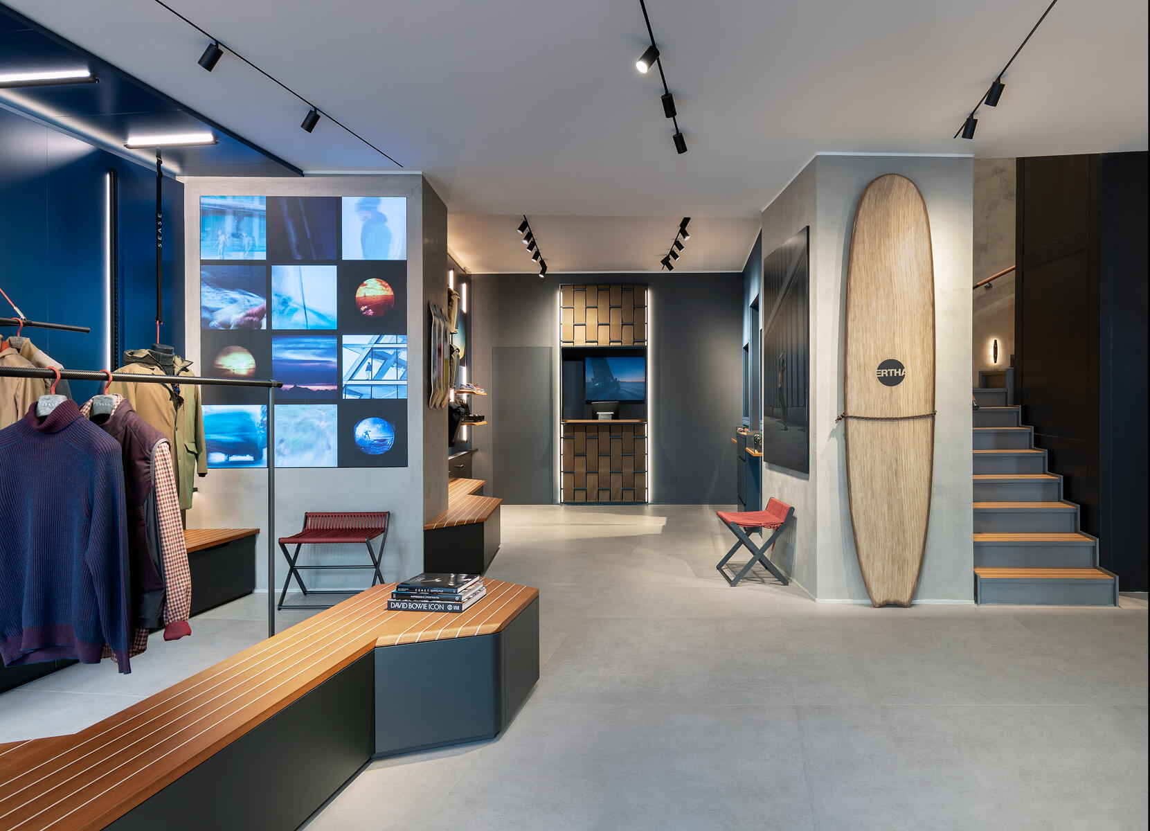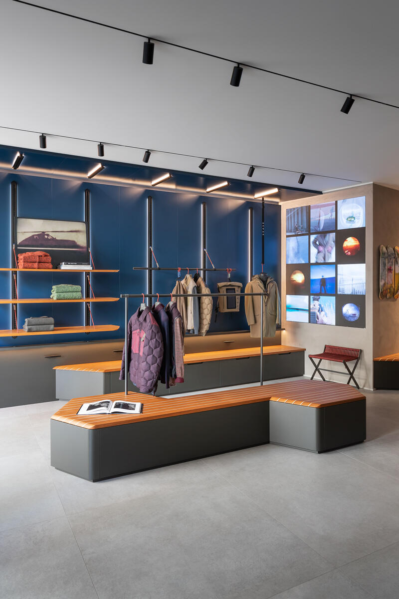 _The elegance of the garments is reflected in the minimal graphic lines of the trimless tracks, and further accentuated by the teak wood furnishings created by the designer Sebastiano Tosi.