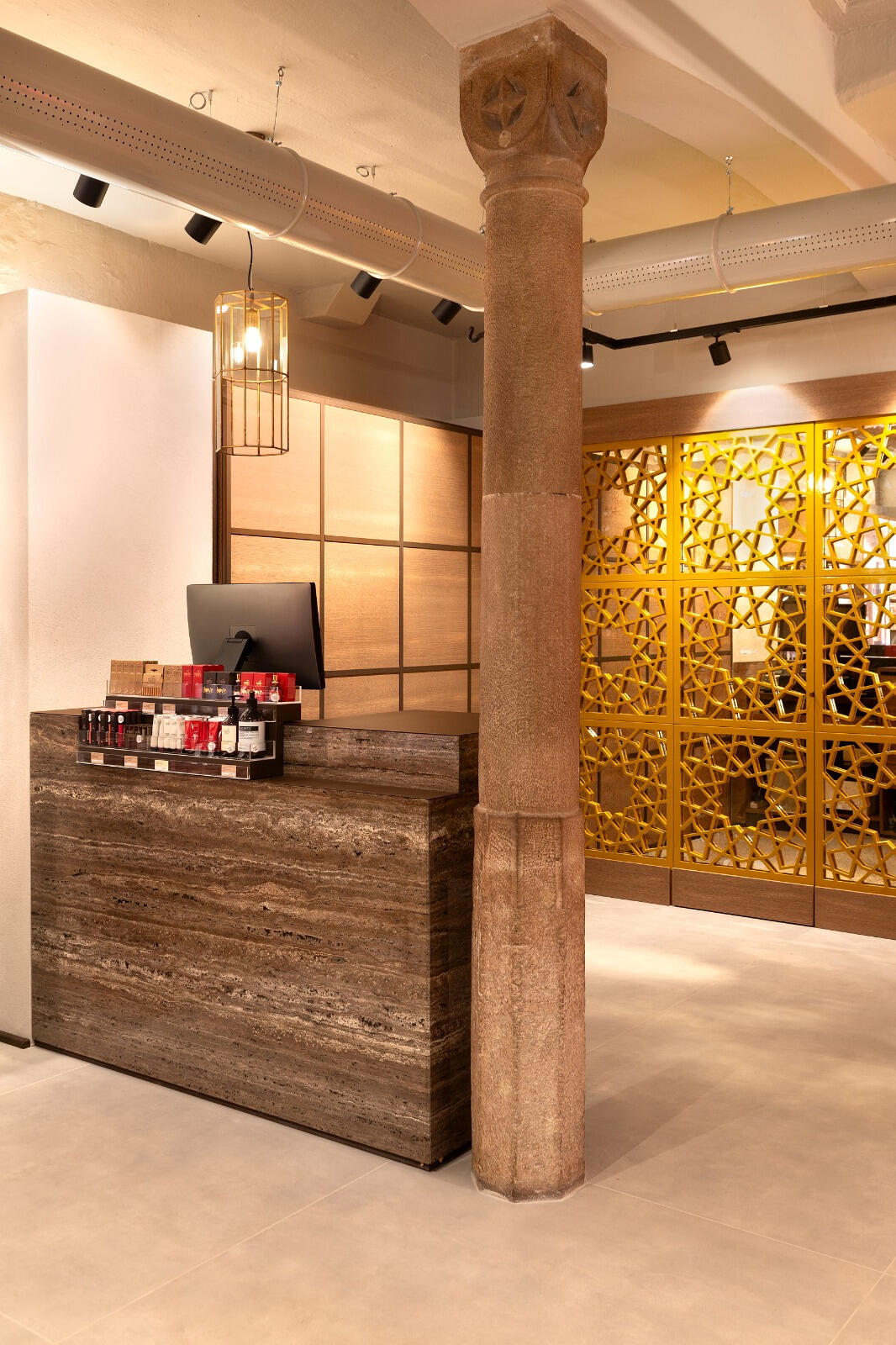 _The client's request was to create a warm and welcoming environment that would highlight the natural finishes of the furnishings and respect the internal architecture of the ancient building that houses it, minimizing the number of lighting fixtures in the space.